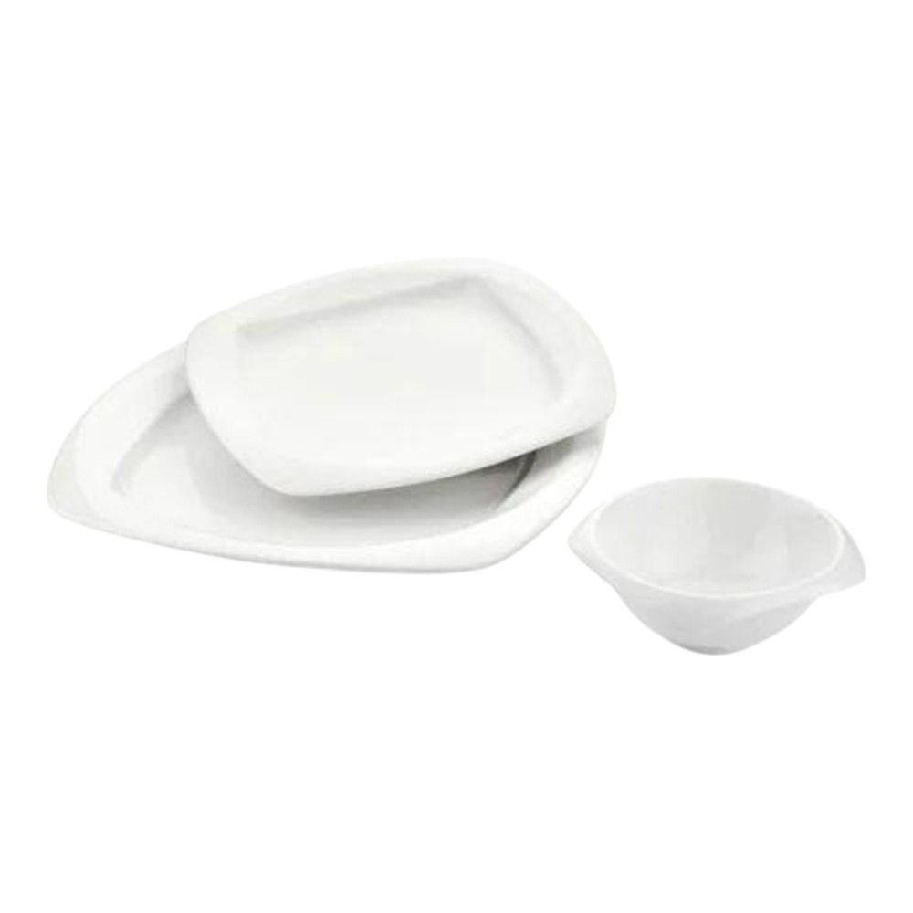 This modern 3-piece serving set is crafted from sleek, bright white porcelain. It includes a large, organically-shaped platter, a smaller rectangular plate with softly curved edges, and a matching dip bowl, perfect for contemporary entertaining.