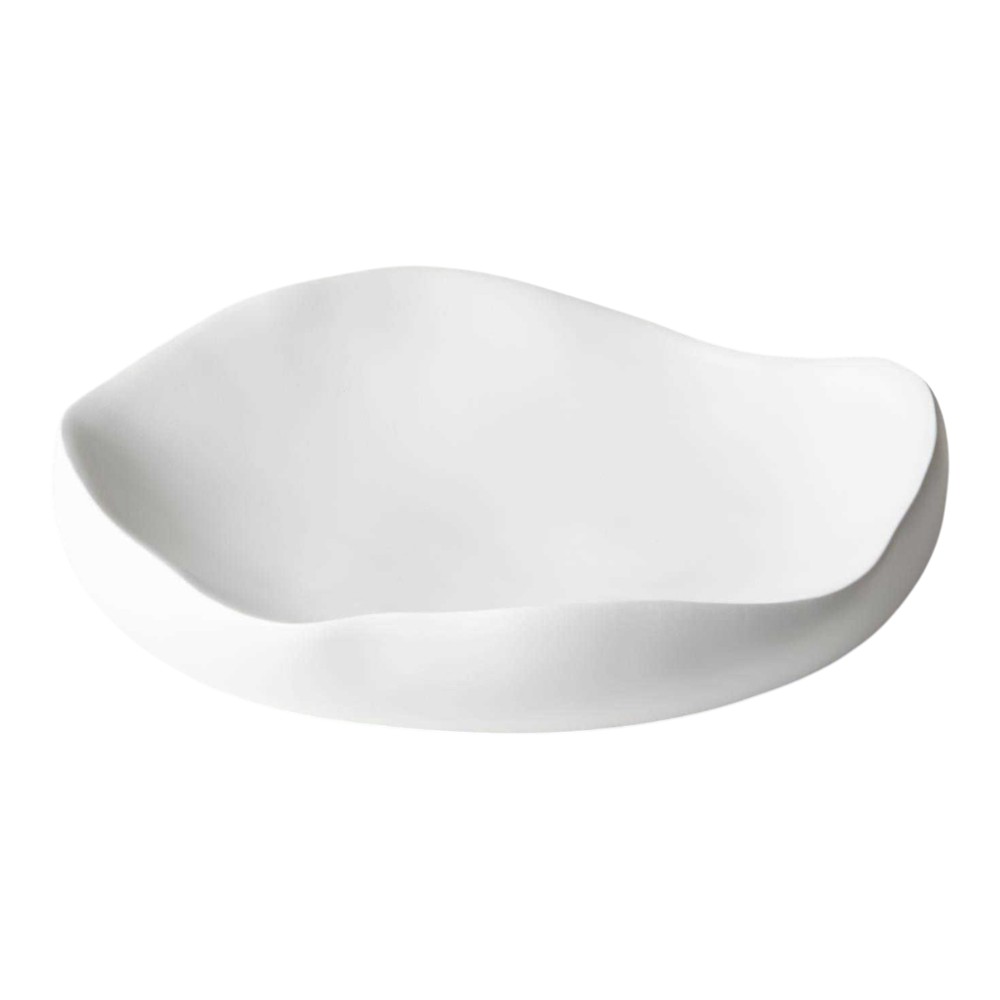 This modern, minimalist bowl features a unique, organic, free-form shape with gently flowing, asymmetrical lines. It is crafted with a smooth, matte white finish, making it a perfect sculptural centerpiece or a sophisticated fruit bowl for a contemporary home.