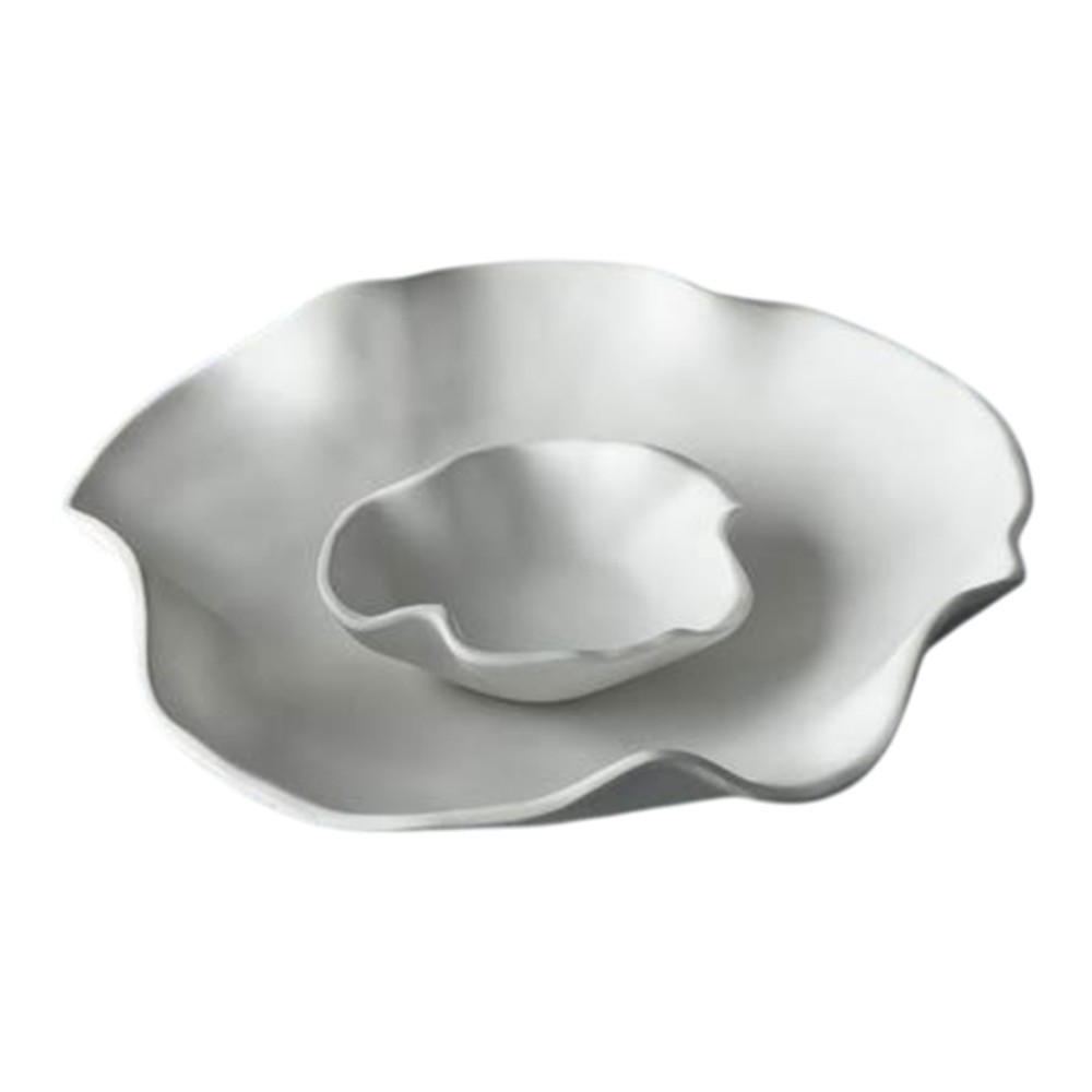 This modern, 2-piece serving set features a large, shallow platter and a matching, nested dip bowl. Both pieces are defined by their organic, free-form, and wavy rims, and are finished in a smooth, elegant matte white.