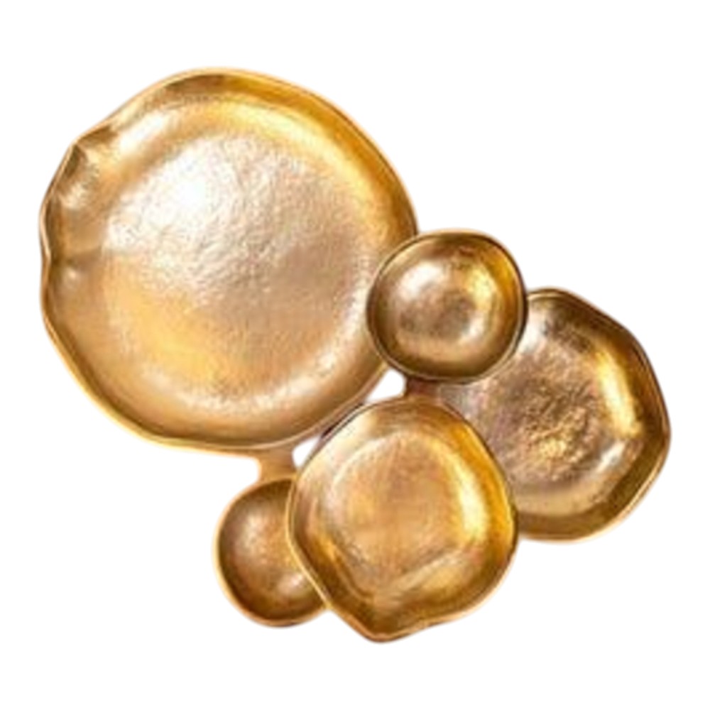 This striking centerpiece bowl features a cluster of five organically-shaped, interconnected dishes in various sizes. The entire piece is crafted from metal and finished in a rich, textured antique gold, making it a glamorous focal point for a dining table or console.