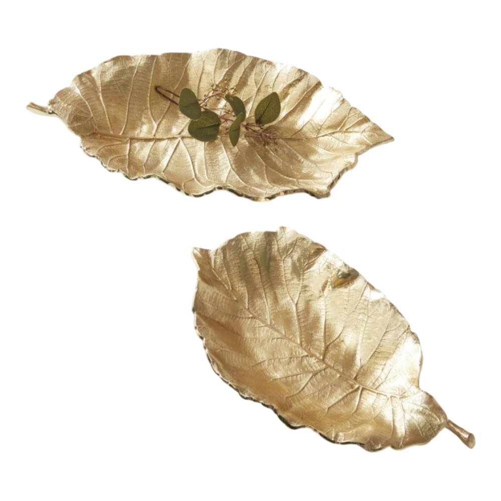 This elegant set includes two large decorative trays, each crafted in the realistic shape of a leaf. Both pieces feature intricate, etched vein detailing and are finished in a sophisticated, soft brushed gold, perfect as a stunning centerpiece or catchall.