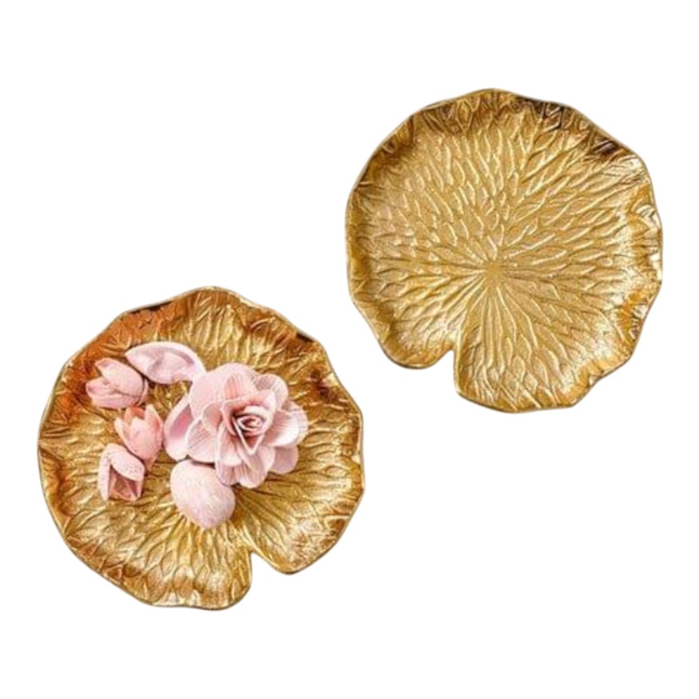 This elegant set includes two decorative shallow bowls, each realistically shaped like a lily pad (or nasturtium leaf). Both pieces are crafted from metal and feature a rich, intricate vein texture, all finished in a warm, antique gold.