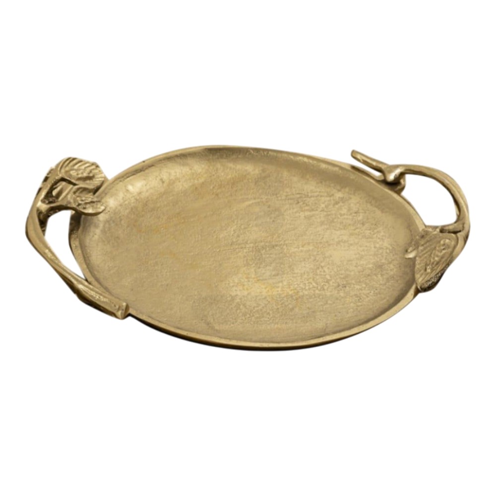 This elegant oval tray is crafted from metal with a textured, antique gold finish. It features two unique, asymmetrically sculpted handles, artfully designed to resemble a vine and leaf, adding a sophisticated, botanical touch.