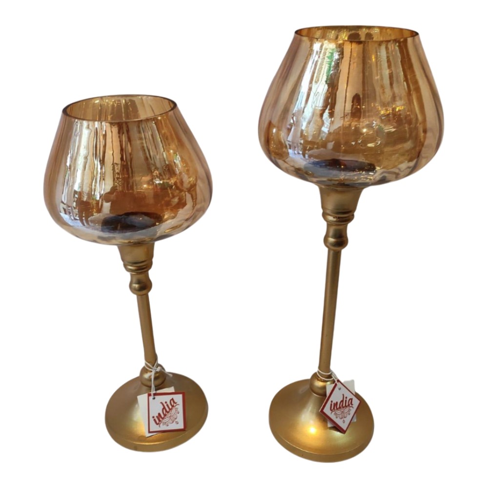 This elegant set includes two stemmed candle holders in staggered heights (one tall, one short). Both feature a large, goblet-shaped cup made of beautiful, amber-tinted glass. They are supported by slender, matching stems and round pedestal bases in a sophisticated matte gold finish.