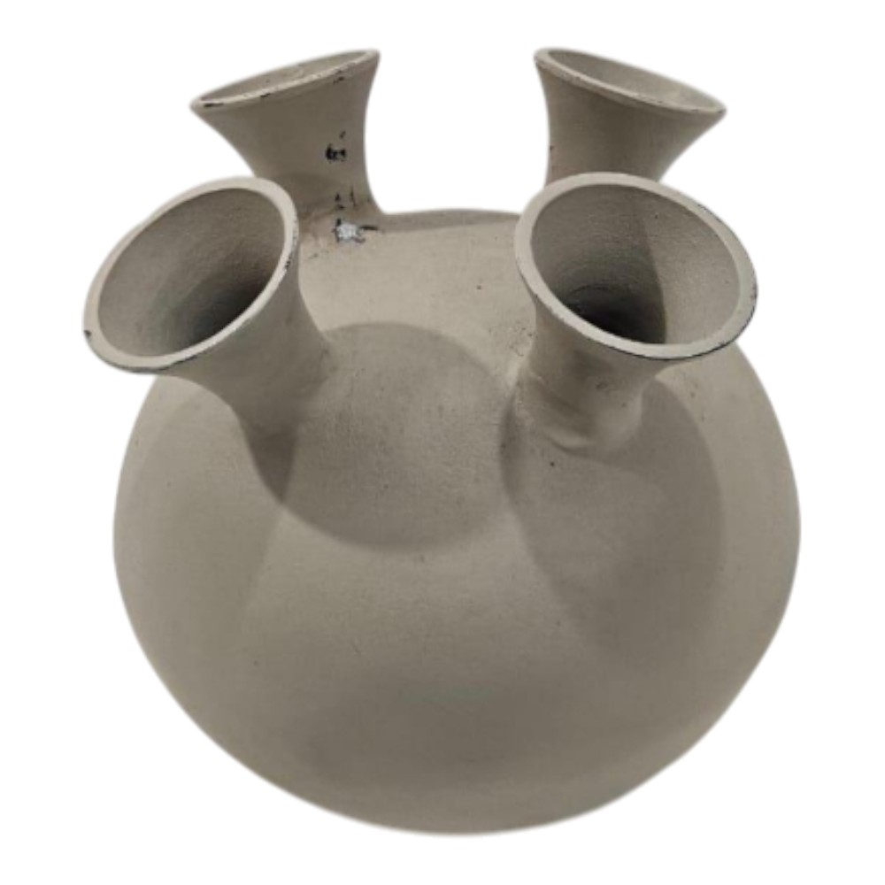 This modern, sculptural vase features a large, globular body with four distinct, trumpet-flared necks for holding individual stems. It is crafted with a matte, off-white (or light grey) finish and a rustic, stone-like texture, making it a striking, minimalist accent piece.