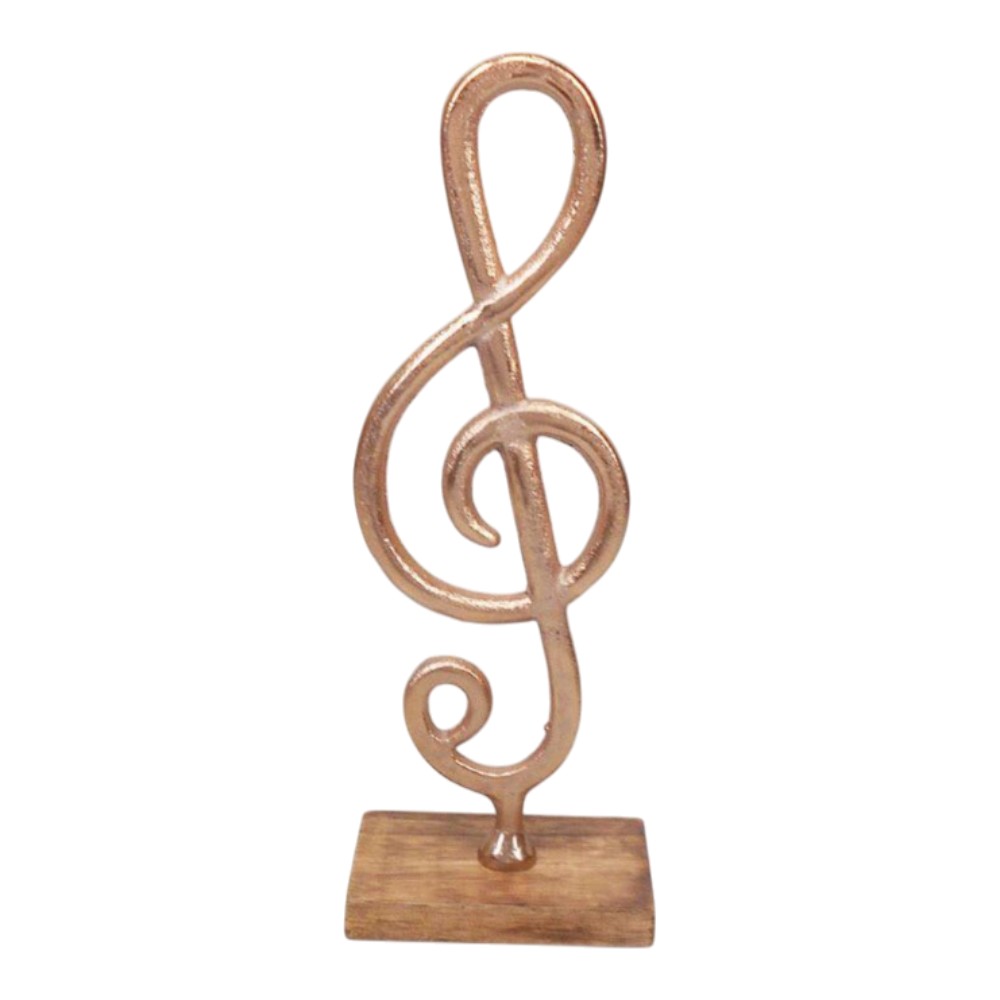 This elegant table sculpture features a large treble clef (G-clef) crafted from metal with a textured, rustic rose gold or copper finish. It is securely mounted on a solid, natural wood block base, blending musical charm with rustic style.