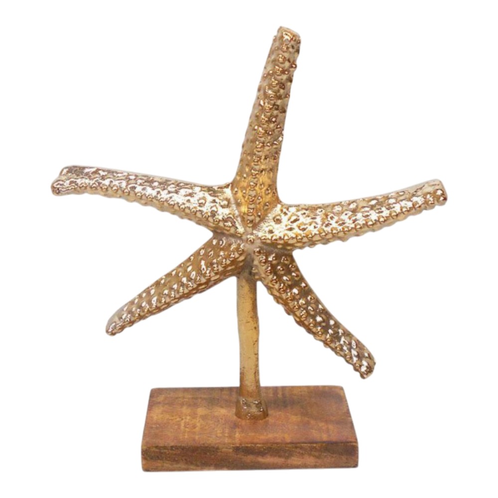 This coastal-inspired sculpture features a detailed, textured starfish mounted on a simple stand. The starfish is finished in a rustic, antique gold, beautifully contrasting with the solid, dark natural wood base. It’s a perfect accent for a beach house or coastal-themed room.