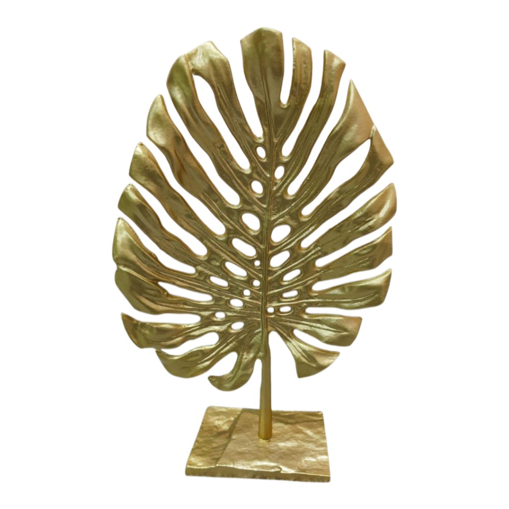 This modern botanical sculpture features a large, stylized Monstera (Swiss cheese plant) leaf, finished entirely in a textured, brushed gold. The leaf is elegantly mounted on a slender stem and a matching square pedestal base, perfect for adding a touch of tropical glam to any shelf or mantel.