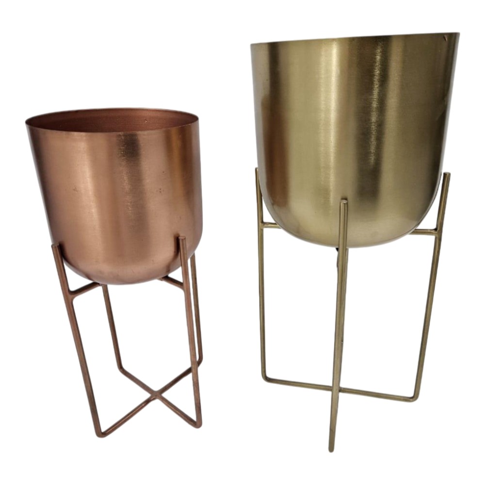 This modern set includes two metal bullet-shaped planters on minimalist stands, featured in two different sizes and finishes. The set includes one large planter in a brushed gold/brass finish and a smaller planter in a brushed copper finish, perfect for adding a touch of mid-century modern style to any room.