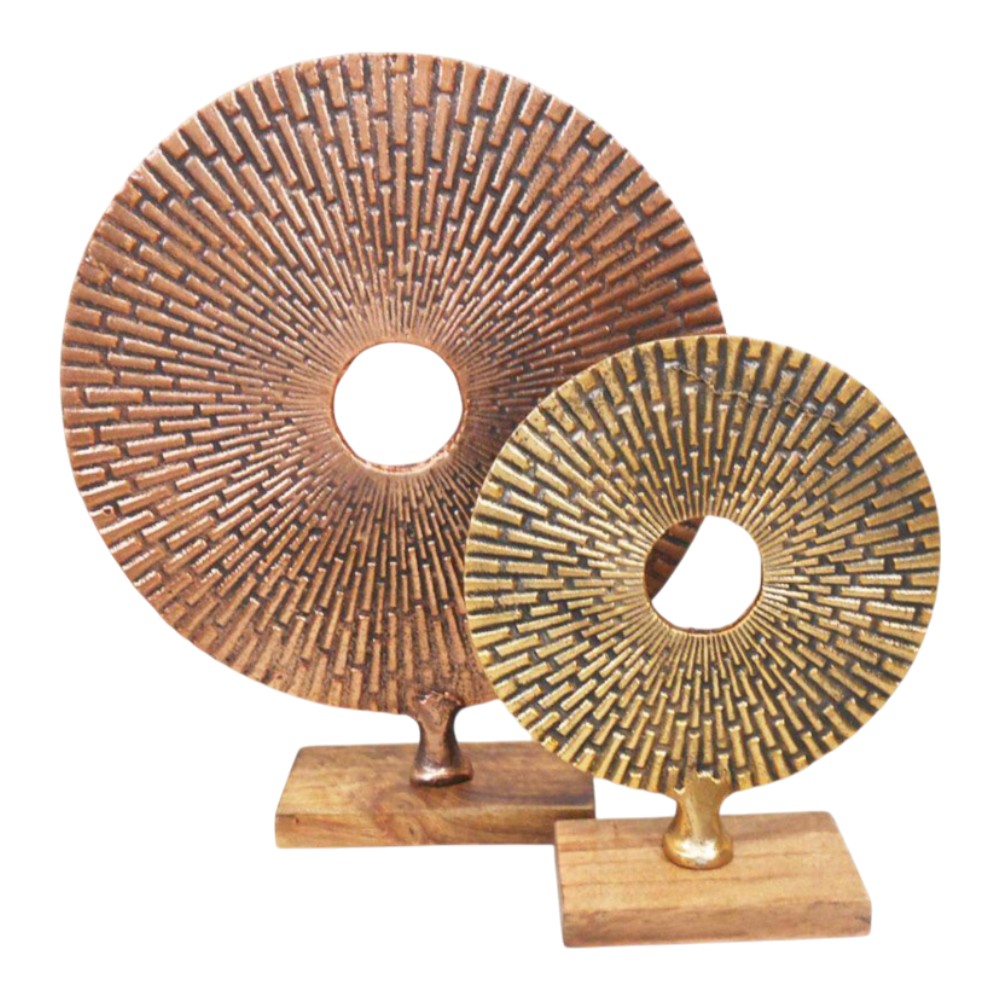This striking set includes two abstract disc sculptures in staggered sizes, both featuring a central cutout. The large disc has a textured, rustic copper finish, while the smaller one features a matching texture in an antique gold. Each piece is mounted on a solid, natural wood block base.