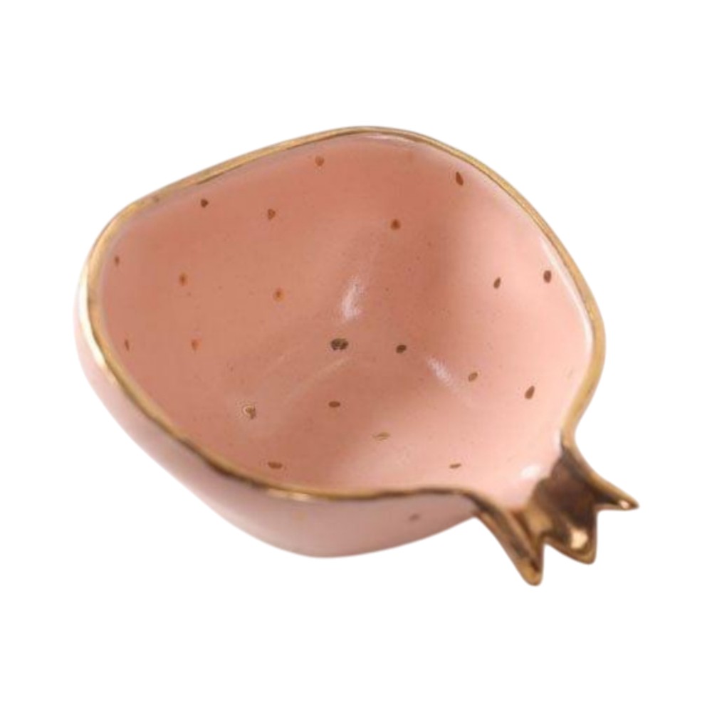 A delightful pomegranate-shaped trinket dish in soft pink ceramic. It features delicate gold dots and a gilded rim and stem, making it a perfect spot for jewelry or keys.