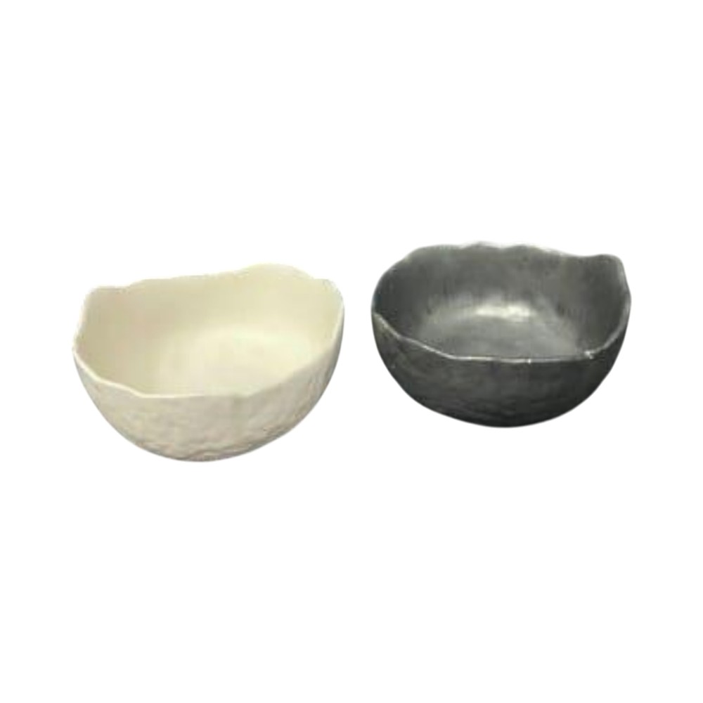 A minimalist set of two decorative bowls in contrasting tones: a raw, matte cream and a deep, textured charcoal gray. Their organic shape and subtle wavy rim lend an artistic, hand-formed look perfect for modern rustic decor.