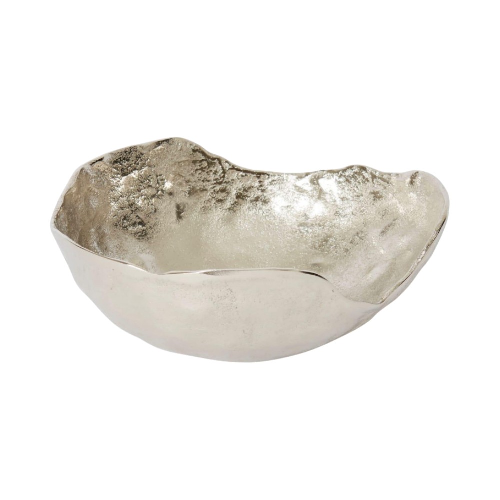A highly sculptural bowl with a fluid, asymmetrical shape and wavy, dynamic rim. The piece features a rich, polished golden finish that makes it a luxurious centerpiece.