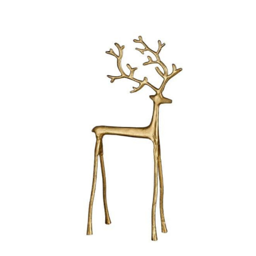 An elegant gold reindeer figurine defined by its contemporary, stylized form. It features a minimalist body, exaggerated slender legs, and a proudly-held head with branching antlers. The textured finish adds a touch of warmth.
