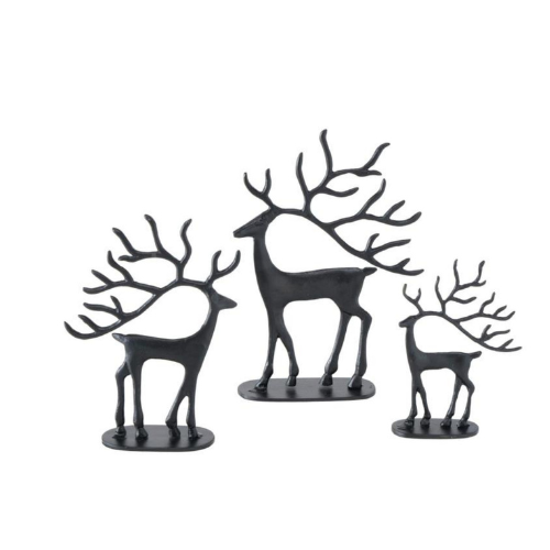 This set of three modern reindeer sculptures features a unique, open-body design that highlights their elegant silhouettes. Finished in a sophisticated matte black, each reindeer stands on a simple oval base and showcases impressive, branching antlers. The set includes three deer in coordinating, yet distinct, poses.