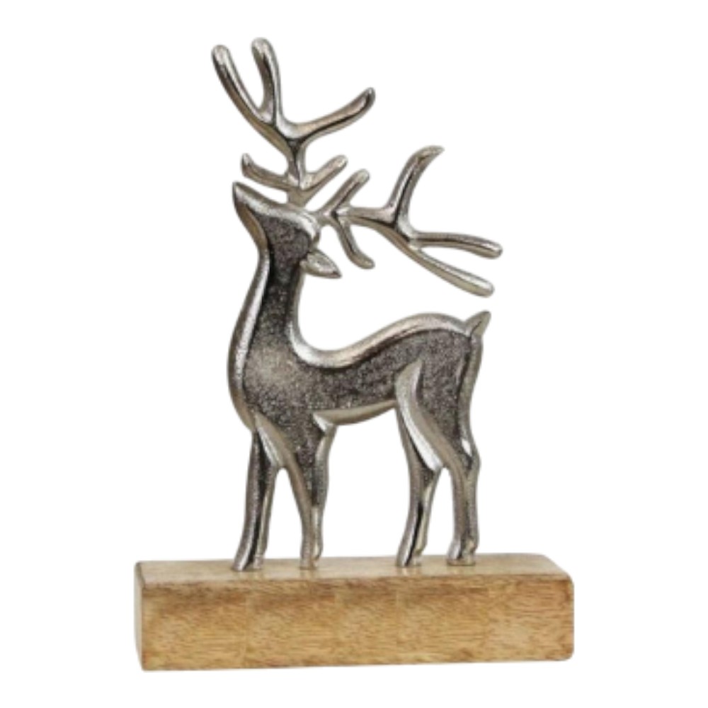 This modern reindeer sculpture features a proud, standing stag with its head held high. The figure is crafted from metal with a textured, brushed silver finish and is mounted on a solid, natural light wood base, blending rustic and contemporary styles.