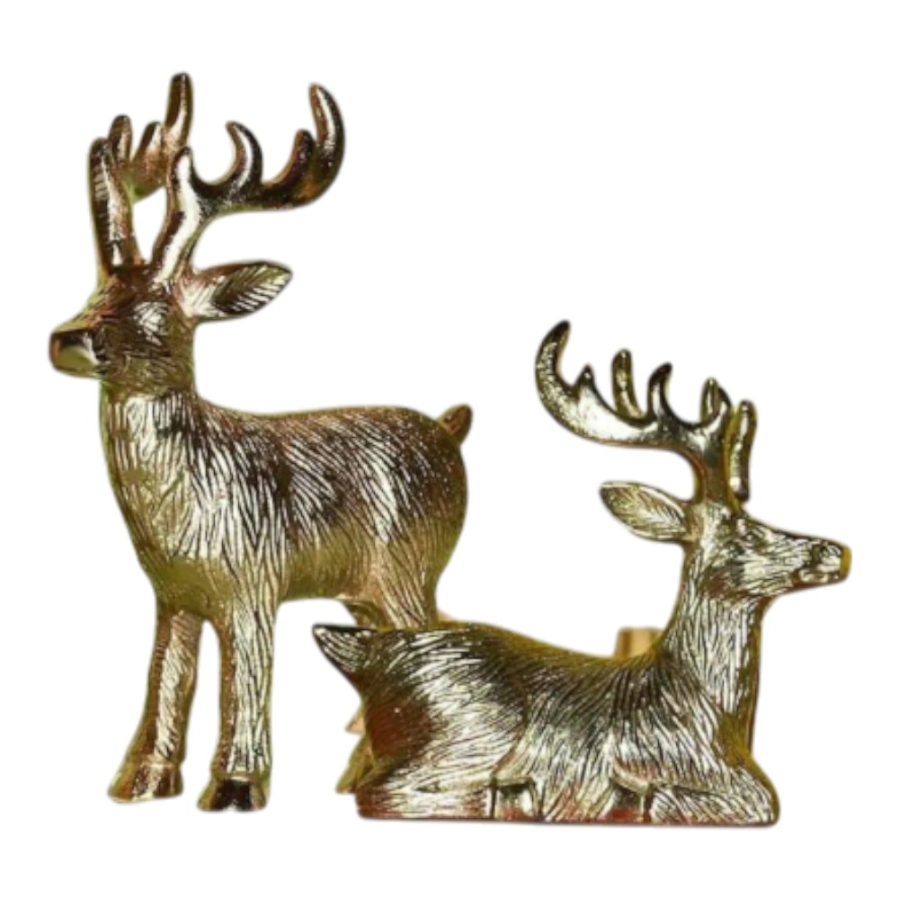 This classic set includes two reindeer figurines, one standing and one lying down. Both pieces are finished in a bright, textured gold, featuring detailed antlers and a brushed, fur-like surface. They are a perfect, traditional accent for any holiday centerpiece or mantel display.