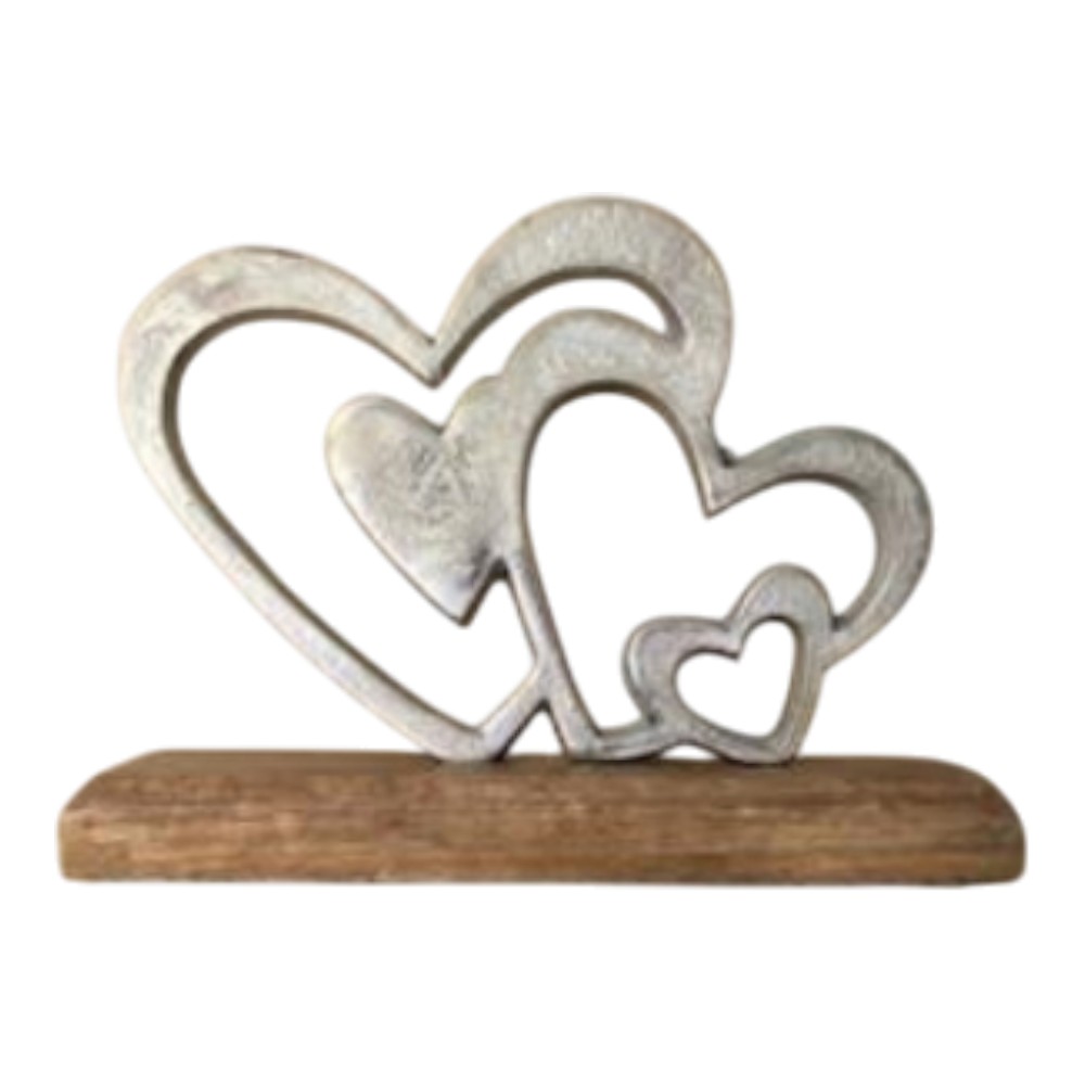 This charming table sculpture features three interlocking open-outline hearts in graduating sizes. The hearts are crafted from metal with a rustic, brushed silver (or distressed white) finish and are mounted on a solid, natural wood base, blending modern and rustic styles.