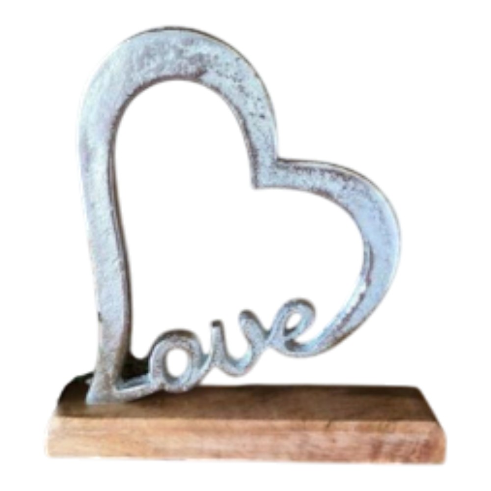 This charming table sculpture features a free-form, open heart outline with the word “Love” elegantly scripted into the design. The heart is crafted from metal with a rustic, distressed white finish and is mounted on a solid, natural wood base.