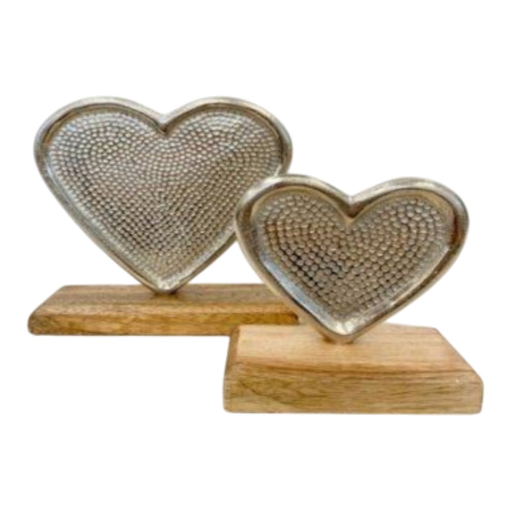 This decorative set includes two heart sculptures, one large and one small, each mounted on its own rustic natural wood base. The hearts feature a beautiful, hammered (or dotted) texture in a silver finish, creating a charming contrast with the smooth wood blocks.