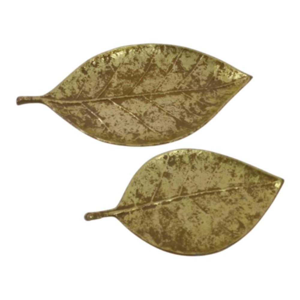 This is a set of two charming decorative leaf dishes featuring a detailed, organic shape with naturalistic veining. Crafted from metal, they are finished in a rich distressed antique gold, giving them an aged and sophisticated appearance. Perfect for holding jewelry, keys, or small candies, these leaf-shaped trays add a touch of botanical elegance and metallic warmth to any tabletop or dresser.
