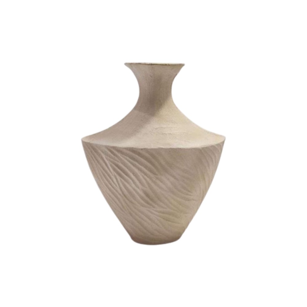 This is a striking decorative vase featuring a balanced, hourglass or flared silhouette. The smooth, refined upper portion contrasts with the angular, conical lower body, which is deeply carved with a swirling, wave-like texture. Finished in a matte, light neutral tone (like beige or off-white), this piece serves as an elegant, high-texture statement accent ideal for modern and organic decor styles.