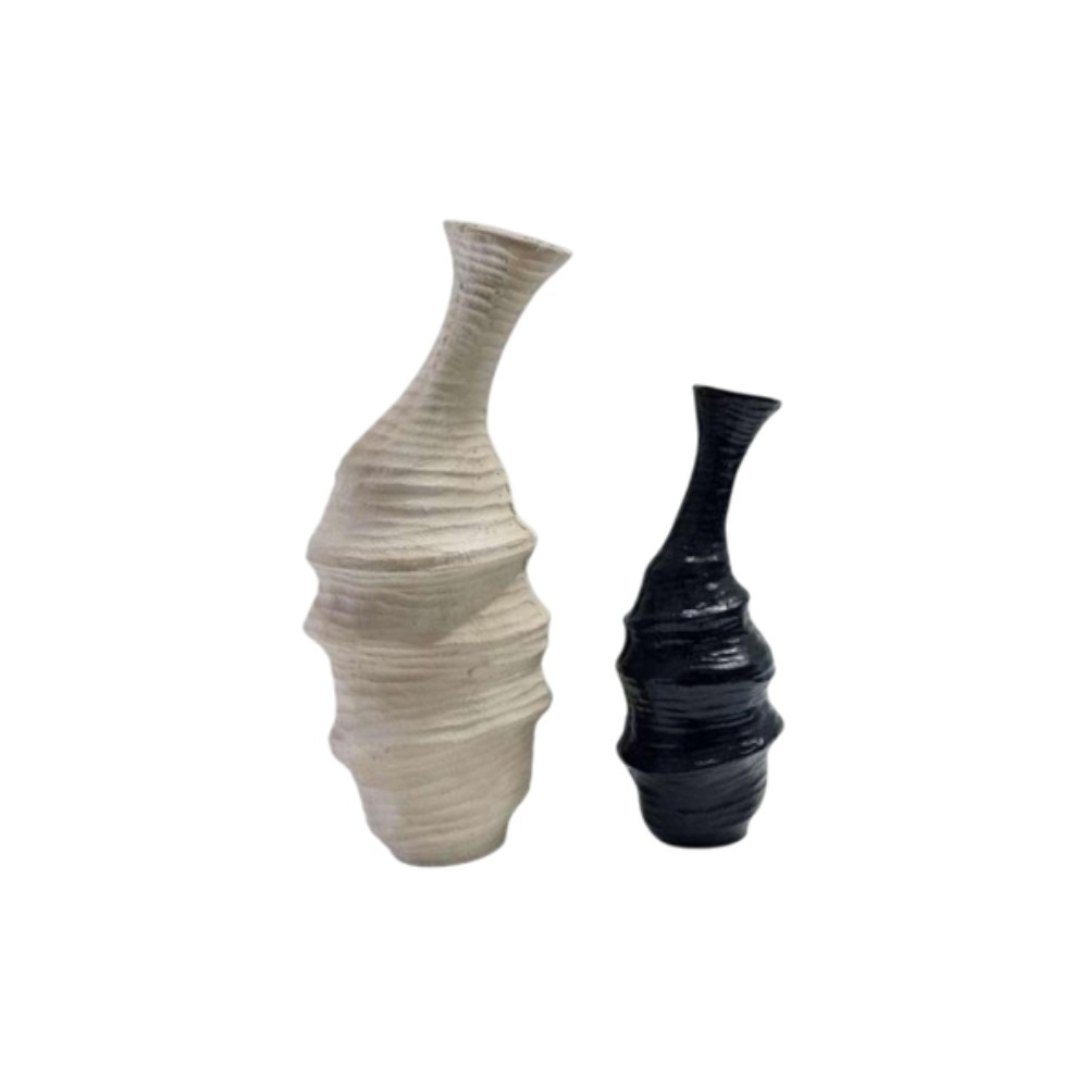 This is a pair of contrasting decorative vases (one tall/cream, one small/black) featuring a highly sculpted, organic form. Each vase has a dramatically curved, twisting neck and a body covered in a prominent horizontal, swirling textured pattern. The black and white/cream color palette creates a bold, high-contrast look, while the unique, liquid-like shaping provides a modern, sculptural accent perfect for contemporary and abstract decor.