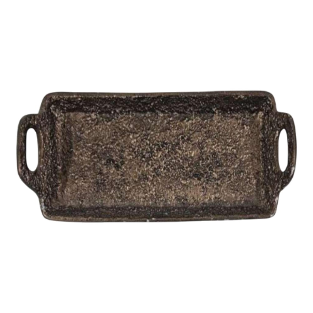 A sturdy, rectangular serving or decor tray with a deep, heavily textured surface and a dark, distressed antique bronze finish. The integrated handles and robust construction give it a cool, industrial-chic appeal.