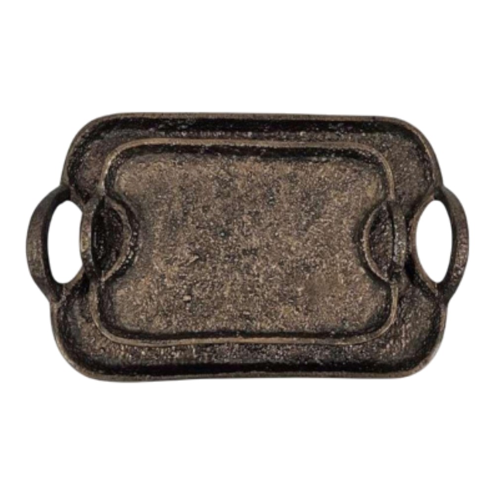 A charming, dark metal tray with a timeless silhouette. Features a deeply textured, aged bronze finish and rounded handles, making it perfect as a small catch-all for keys, jewelry, or as a decorative accent on a vanity or bookshelf.