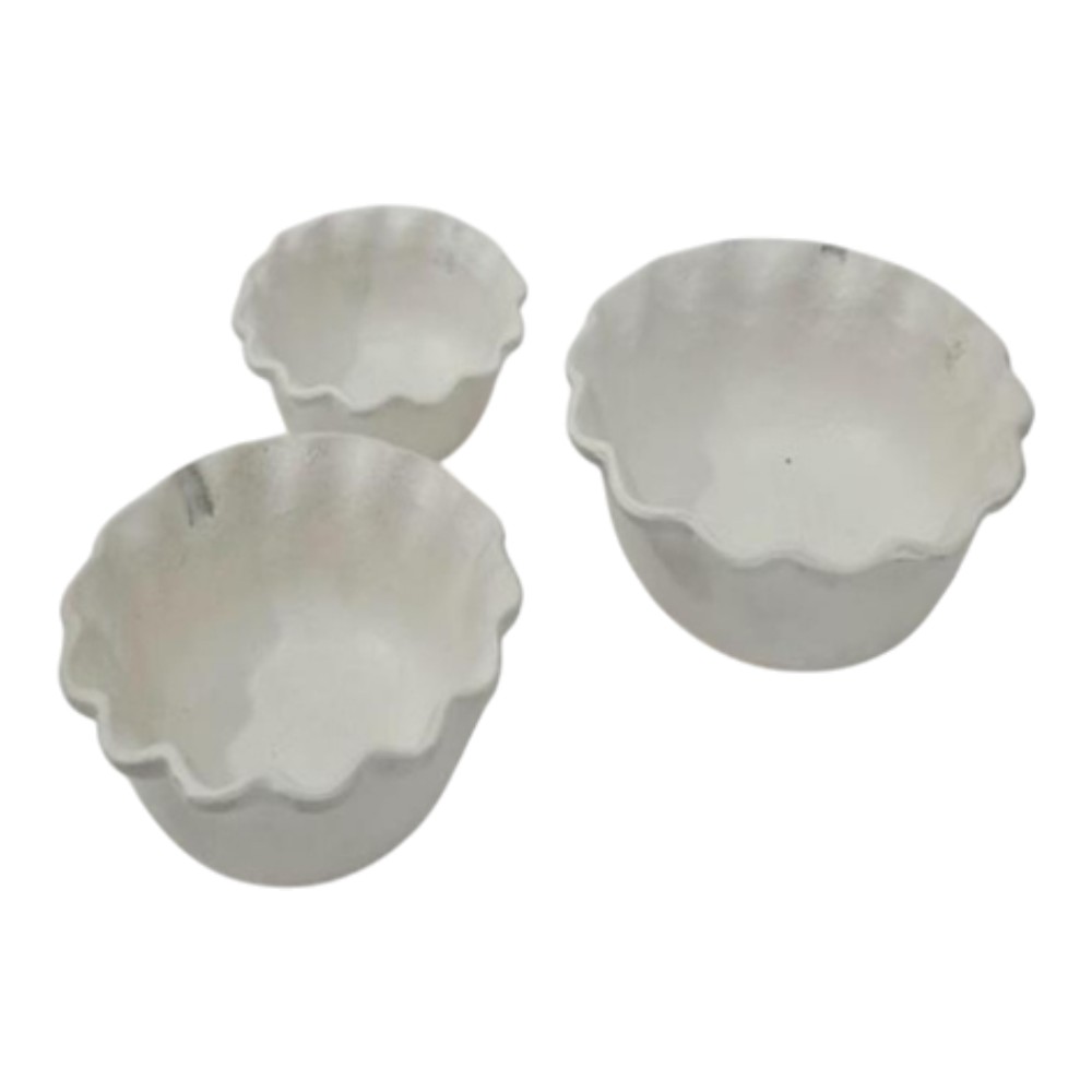 This is a delightful set of three nesting ceramic bowls featuring a charming, scalloped or ruffled rim. Finished in a matte, off-white or light grey color, the bowls have a rustic, handcrafted appearance and smooth, rounded bases. This versatile set is perfect for serving condiments, small side dishes, or as decorative containers for keys and small treasures.