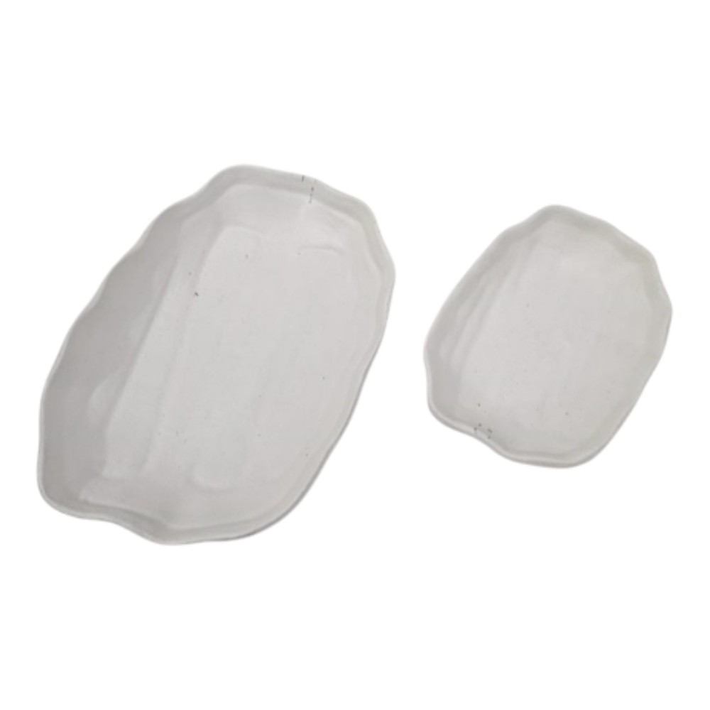 This is a set of two ceramic serving dishes in complementary sizes, featuring a contemporary, organic, free-form shape with soft, irregular edges. They are finished in a smooth, matte off-white or creamy beige glaze and display subtle surface variation, lending them a handmade, wabi-sabi appeal. This versatile duo is perfect for stylishly serving appetizers, small bites, or as sophisticated trinket trays for keys and everyday essentials.