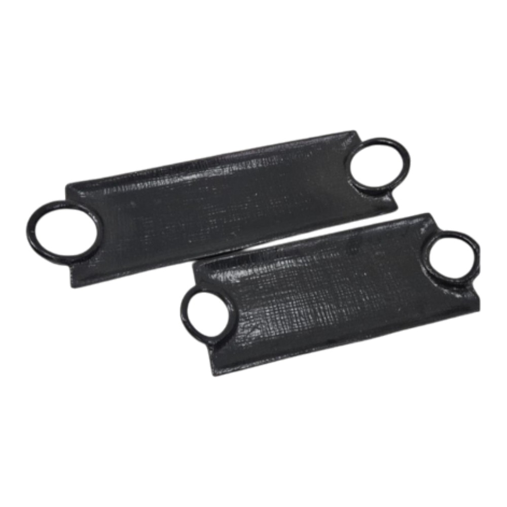 This is a dramatic pair of long, narrow serving dishes featuring a striking modern design. Crafted from metal, they are finished in a deep, glossy black and showcase a subtle cross-hatched texture across the surface. Each tray includes bold, integrated loop handles on the short ends, blending utility with style. These sophisticated pieces are perfect for serving slender appetizers, bread, or as striking decorative trays for keys or small accents.