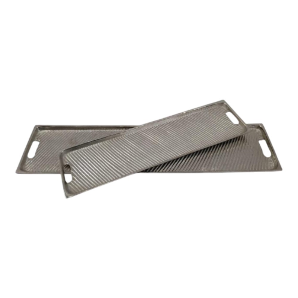 This is a set of two long, narrow rectangular serving trays with a distinct industrial aesthetic. Crafted from metal, they feature a rough, textured pewter or antique silver finish and a striking surface pattern composed of diagonal linear grooves. Each tray includes integrated oval handles on the short ends, making them easy to carry. These pieces are ideal for serving bread, charcuterie, or as unique decorative trays on a modern table setting.