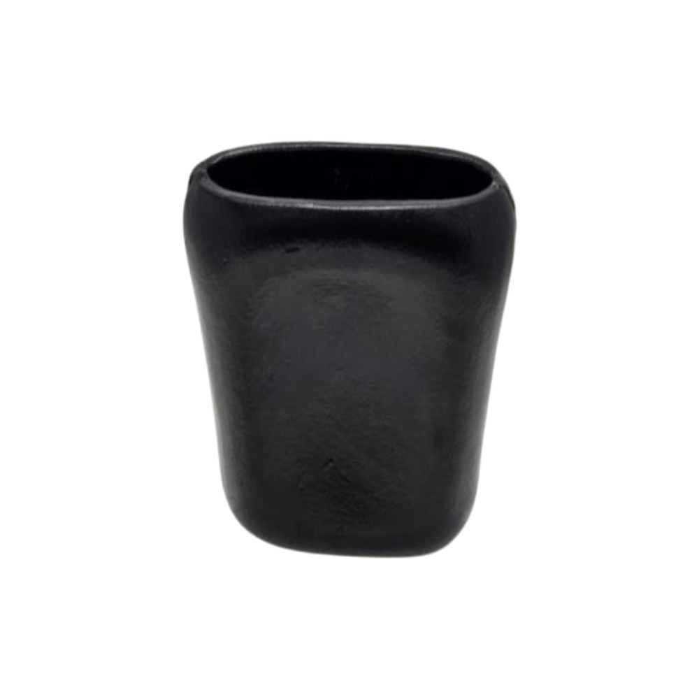 This is a modern, minimalist decorative container, likely a small vase, planter, or catch-all. It features a tapered, rectangular shape with softly rounded corners and a smooth, matte black finish. Its simple, heavy form makes it a versatile accent piece, perfect for adding a touch of sophisticated, dark contrast to any desk, shelf, or counter in a contemporary setting.