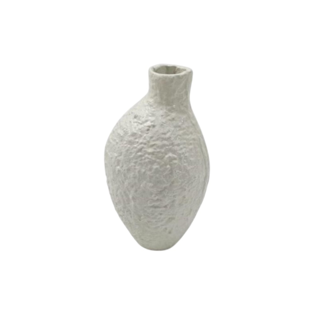 This is a small, sculptural bud vase featuring a unique asymmetrical, elongated pebble or seed shape. The entire surface is covered in a rough, heavily textured, and pitted finish, giving it an earthy, handmade feel. It is finished in a matte white or light cream neutral tone and features a narrow, slightly curved neck. This piece is perfect for adding a minimalist, wabi-sabi, or natural accent to any small space.