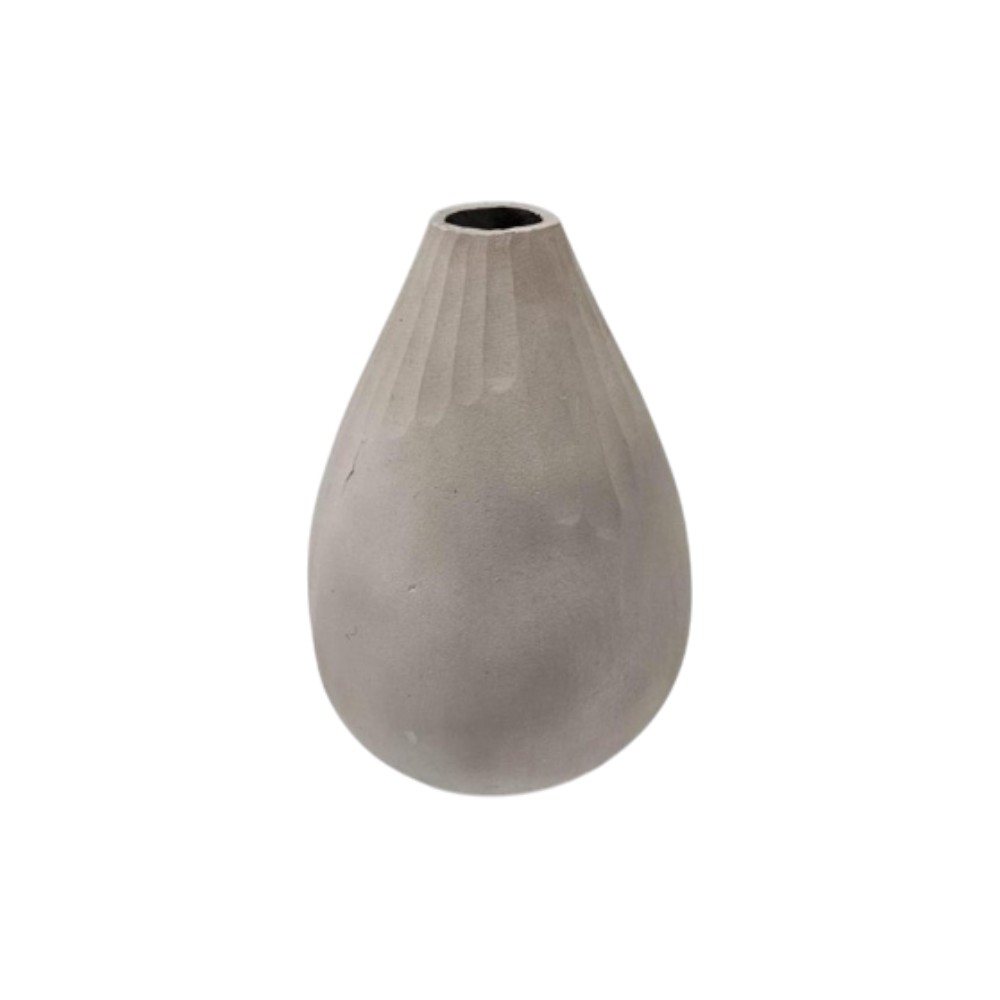 This is a modern, minimalist decorative vase with a smooth, teardrop or ovoid shape and a narrow opening. The lower body is smooth, contrasting beautifully with the upper section which features a subtle vertical fluted or ribbed texture. It is finished in a solid, neutral matte color—like light grey, taupe, or beige. This simple yet elegant piece is perfect as a sculptural accent in contemporary, mid-century, or Nordic-inspired settings.