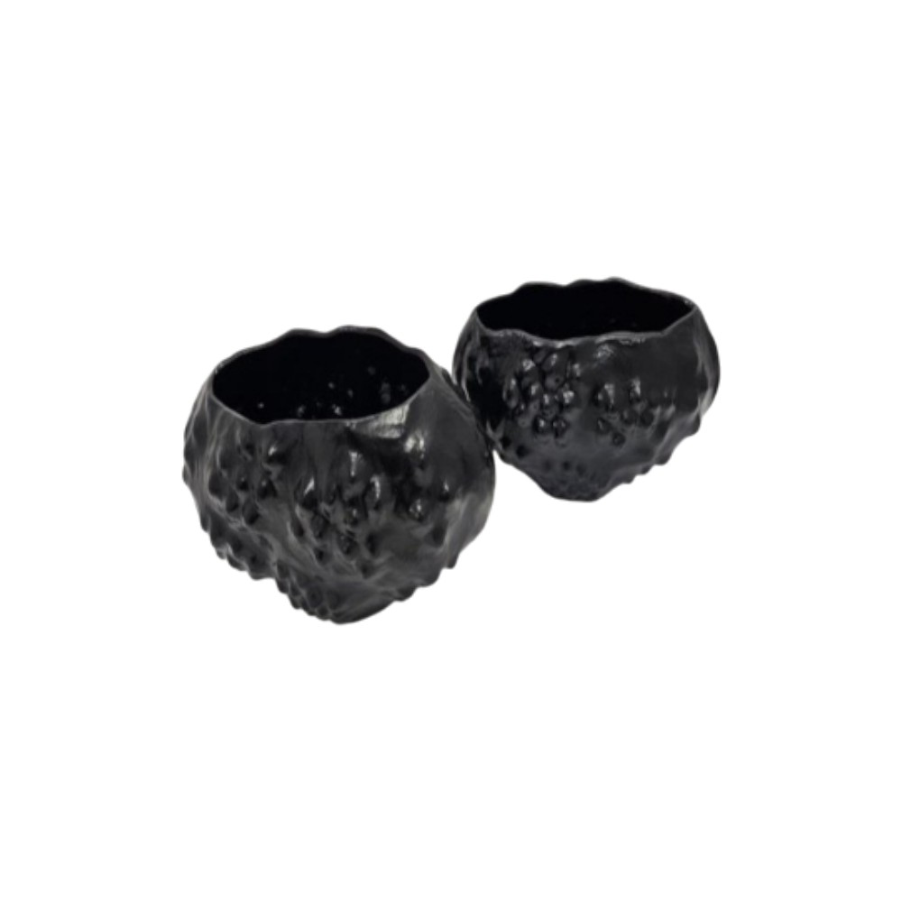 This is a pair of small, spherical decorative bowls or planters with a powerful, organic aesthetic. Each bowl features a heavily textured, bumpy, or molten surface that resembles volcanic rock or dark earth. They are finished in a consistent, deep matte black. With their raw look and irregular rims, these bowls are ideal as striking sculptural accents or unique containers for candles, air plants, or small display items in modern or brutalist decor.