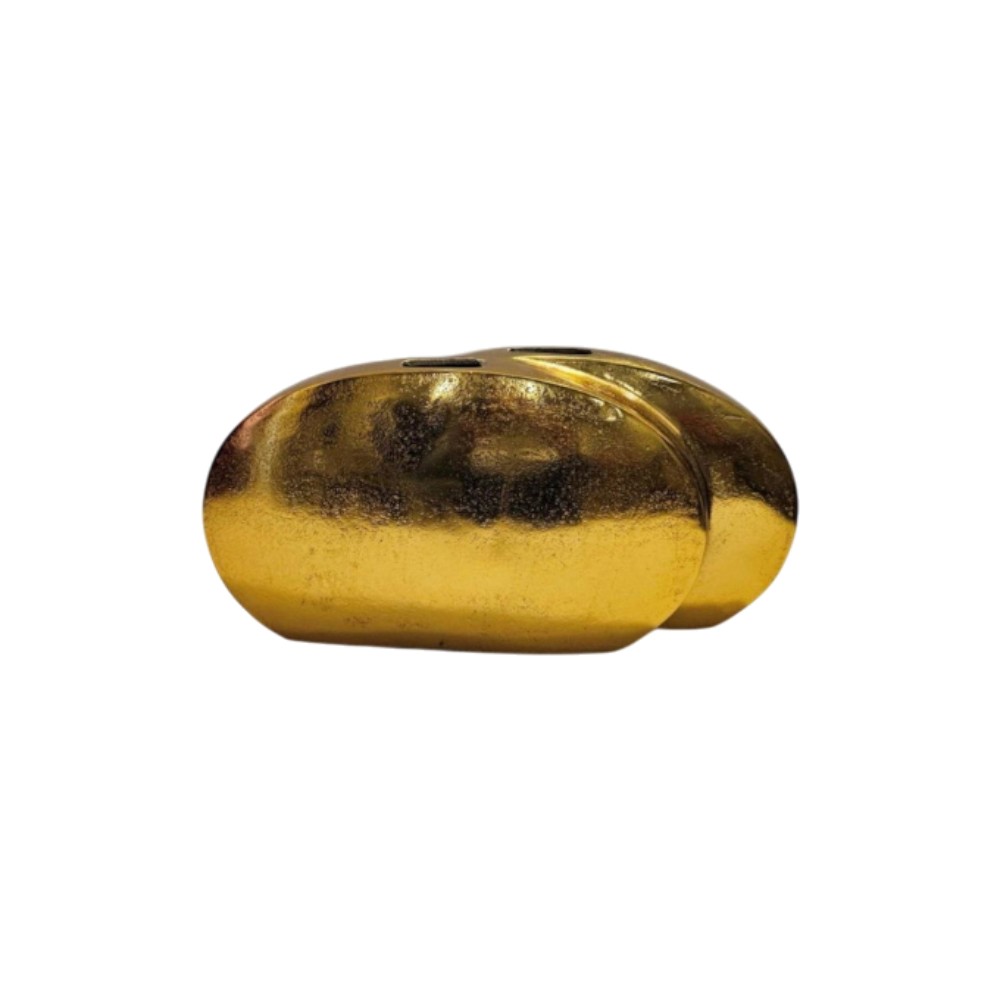 This is a pair of striking decorative vases featuring a sleek, horizontal, flattened oval or pebble shape. They are finished in a highly reflective, distressed metallic gold that gives them a textured, antique glamour. Designed to be displayed closely together, these low-profile vases add a bold, luxurious, and contemporary sculptural accent to a mantelpiece, coffee table, or bookshelf.