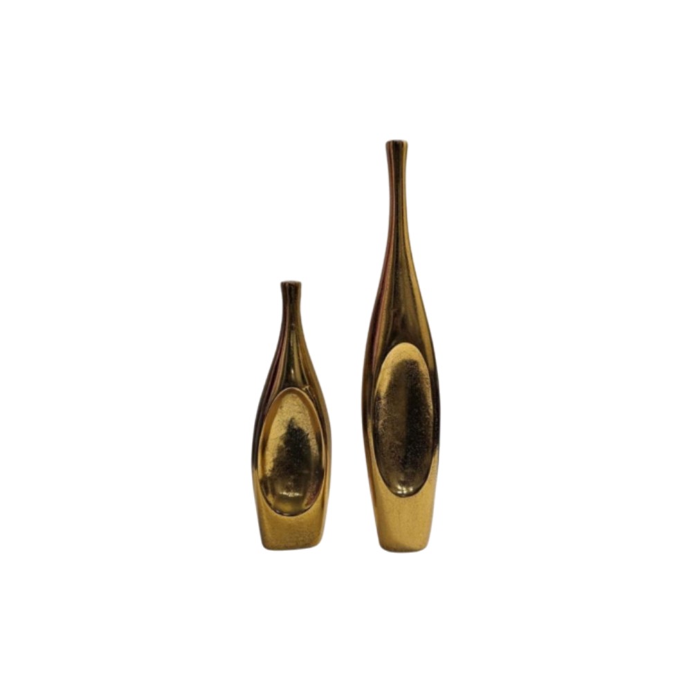 This is an elegant set of two decorative bud vases (one small, one tall) featuring a sleek, hourglass or elongated boat shape with a very narrow neck. They are finished in a rich, reflective metallic gold. A key design feature is the central oval recess on the body of each vase, which has a distinct textured or hammered finish that contrasts with the surrounding smooth gold. This duo makes a luxurious, sculptural statement perfect for contemporary and glamorous interiors.
