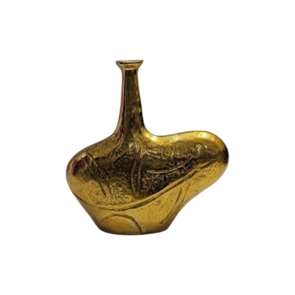 This is a striking, single decorative vase featuring a highly asymmetrical, organic, and abstract shape. It combines a wide, flowing body with a dramatic, upright, and narrow neck. The entire surface is finished in a textured, reflective metallic gold with subtle linear carvings or distressed markings for added depth. This unique piece functions as a bold sculptural statement and adds a touch of artistic glamour to any modern or eclectic decor setting.