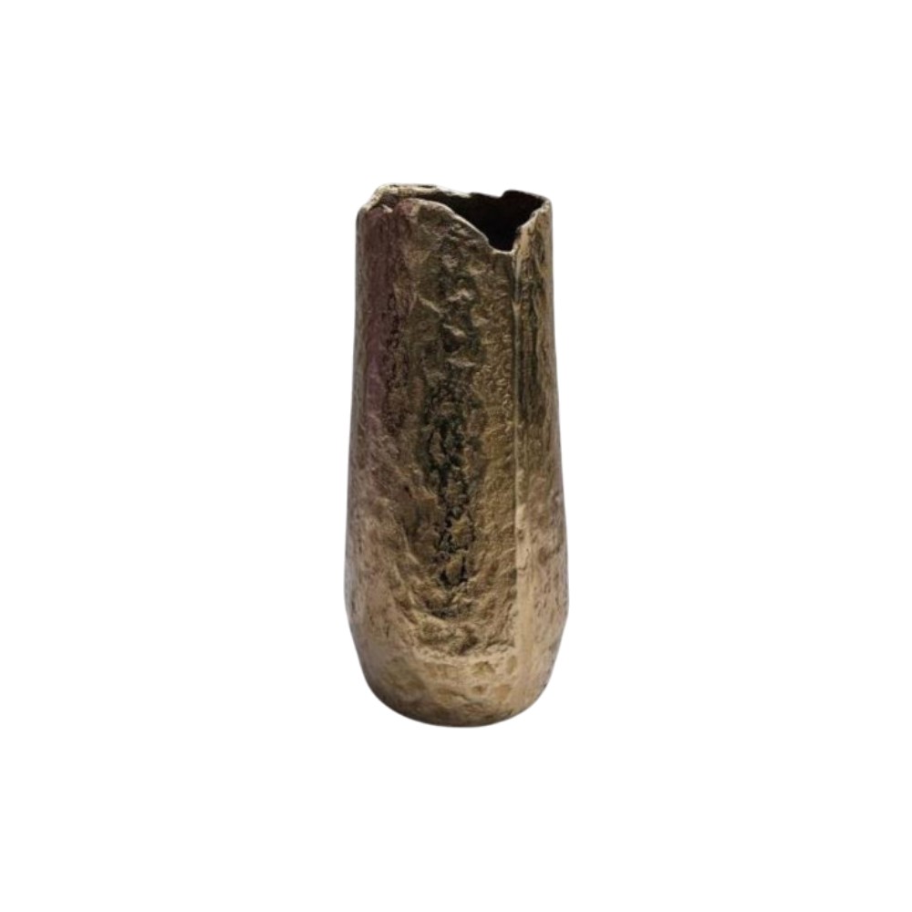 this is a tall, tapered decorative vase with a striking, heavily textured exterior that resembles rough bark or crinkled metal. It’s finished in a distressed metallic bronze or antique gold and features an irregular, jagged rim, giving it a raw, industrial-glam look.
