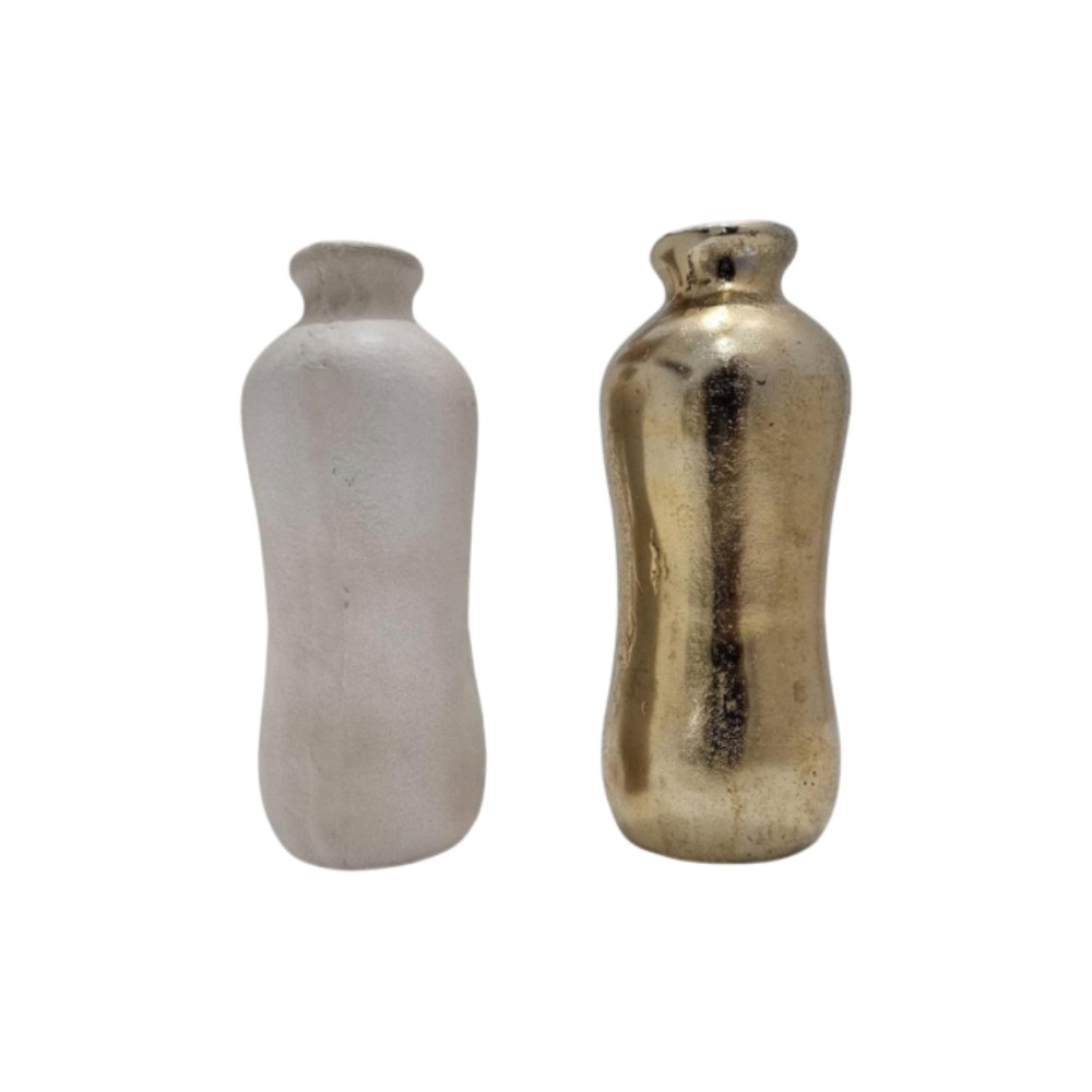 This is a pair of decorative vases (one in metallic gold, one in matte white) featuring an organic, slightly asymmetrical bottle shape with a narrow neck. The gold vase has a reflective, distressed metallic finish with a smooth texture. The white vase has a matte, slightly textured finish with clean lines.