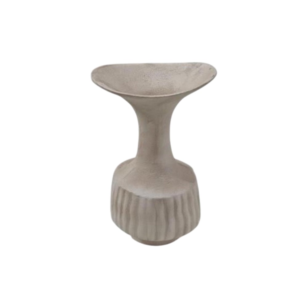 This is a unique, sculptural vase that features a wide, shallow, and flared bowl-like top balanced on a slender neck. The lower, rounded base is detailed with a vertical fluted or ribbed texture. Finished in a matte, light neutral tone (like taupe or beige), this piece is a striking accent that combines geometric and organic forms.