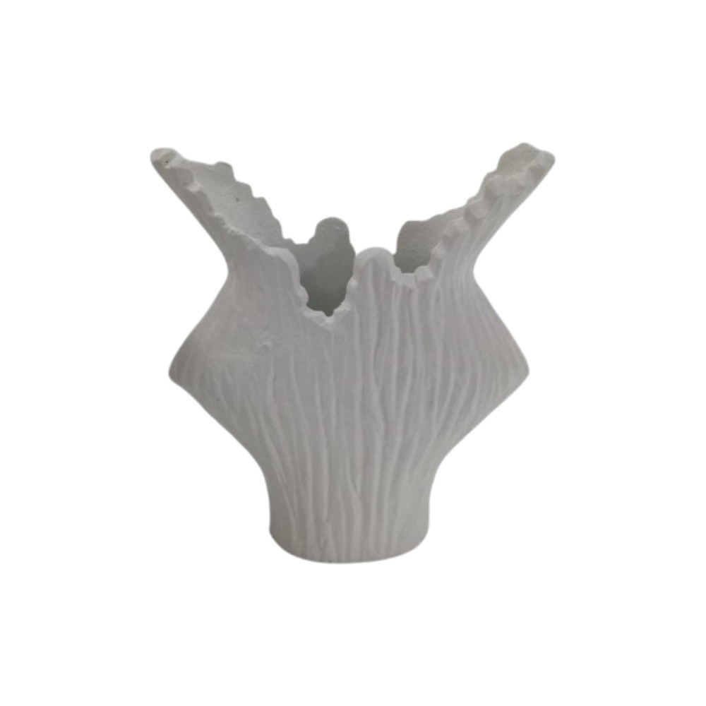 This is an abstract, sculptural decorative piece, likely a vase or centerpiece. It features a unique, flared silhouette with a distinctive rough, vertical texture resembling bark or natural fiber on the lower half. The rim is dramatically jagged and asymmetrical, giving it an organic, “bursting” appearance. Finished entirely in a matte white or light neutral color, this piece serves as a striking, contemporary decor accent.