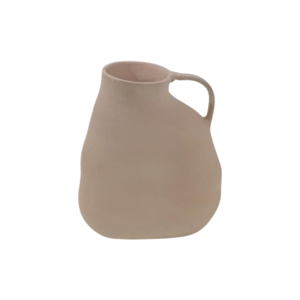 This is a unique decorative jug or vase featuring an appealingly organic, asymmetrical, and rounded body that resembles a hand-thrown vessel. It has a practical, simple handle on the side and a smooth, matte finish in a beautiful neutral shade like dusty rose, blush beige, or taupe. Its irregular form and soft color give it a distinct rustic, wabi-sabi, or Mediterranean aesthetic. Perfect for showcasing dried floral arrangements, grasses, or simply serving as a minimalist sculptural piece on a tabletop or shelf.