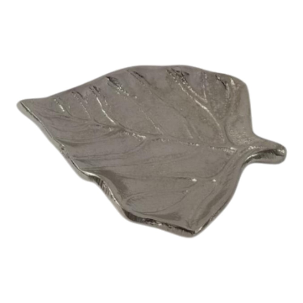 This is a small, elegant decorative dish shaped like a broad, naturalistic leaf. Crafted from metal, it features a smooth, reflective polished silver or chrome-like finish, highlighting the detailed leaf veins and contours. This charming dish is perfect for holding jewelry, small candies, or as a sophisticated, nature-inspired accent piece for a desk or vanity.