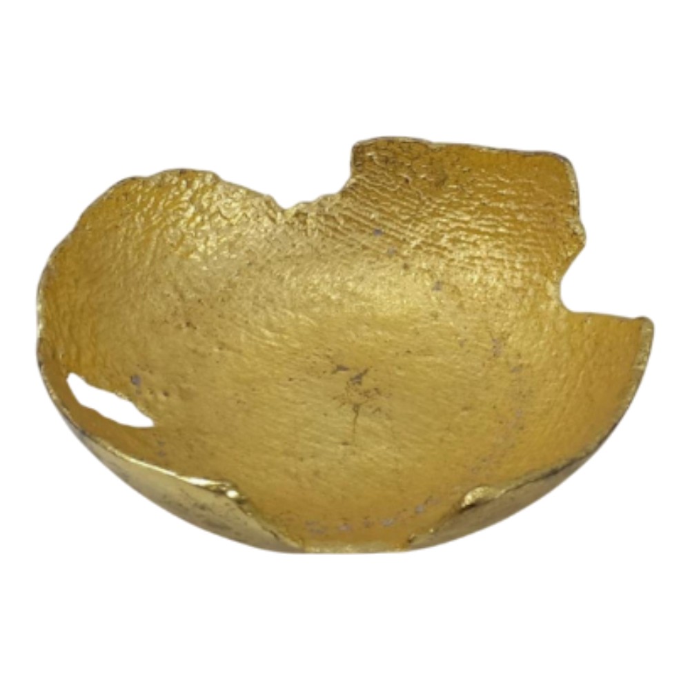 This is a dramatic and tactile decorative bowl with a striking hammered gold finish. The bowl features a distressed, textured surface and an intentionally irregular, fractured rim with cut-out areas, giving it an ancient, organic appearance. This sculptural piece is perfect for serving as a centerpiece, holding potpourri, or adding a rich, metallic accent to contemporary or rustic decor.
