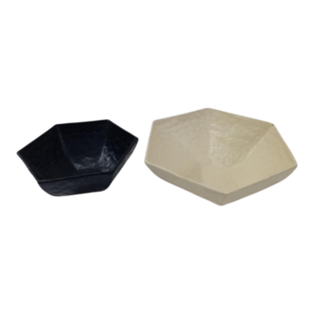 This pair of modern decorative bowls features a striking geometric, hexagonal shape reminiscent of a cut gem or stone. The set includes two contrasting pieces: one finished in a deep, textured matte black and the other in a light, creamy off-white. With their distinct faceted design, these bowls serve as eye-catching accents for storing small items, keys, or simply as stand-alone sculptural decor.