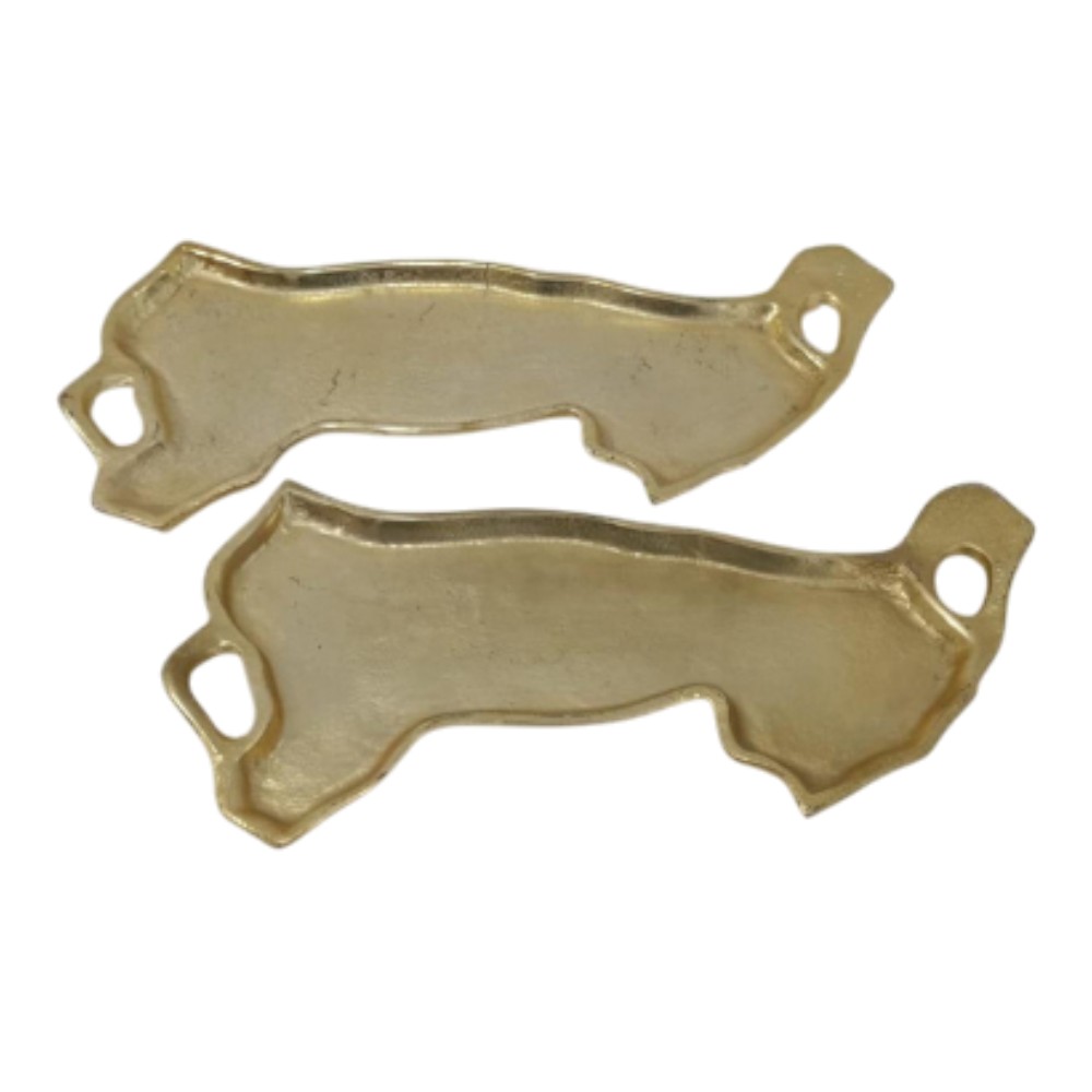 This is a pair of unique, narrow serving trays or trinket dishes crafted from metal with a rich antique gold finish. The design is highly distinctive, featuring an organic, wavy silhouette that tapers toward the middle and flares out at the ends, where they incorporate small, integrated loop handles for easy handling or display. These trays are perfect for showcasing jewelry, serving slender appetizers, or adding a touch of vintage glamour to any surface.