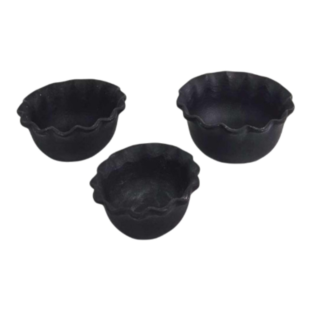 A delightful set of small, decorative bowls featuring an artisanal, fluted or ruffled rim and a clean, matte black finish. Their unique texture adds a touch of sophisticated, organic charm to any display.
